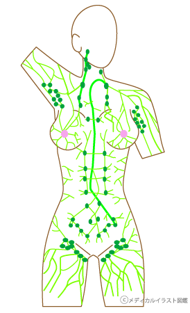 肩口から上腕部にかけて施術します。脇の下にある腋窩リンパ節を刺激して詰まりを取ります。また腋窩動脈をリングで圧迫して、上肢の血流を改善します。自分の腕が自分の腕ではないと感じるぐらい軽くなります。