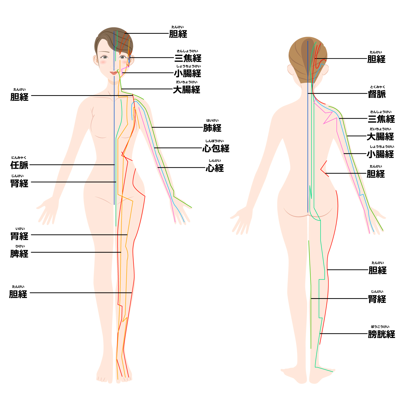 陰経は、体表の内側を通り実質臓器に属します。陽経は、体表の外側を通り中空臓器に属します。