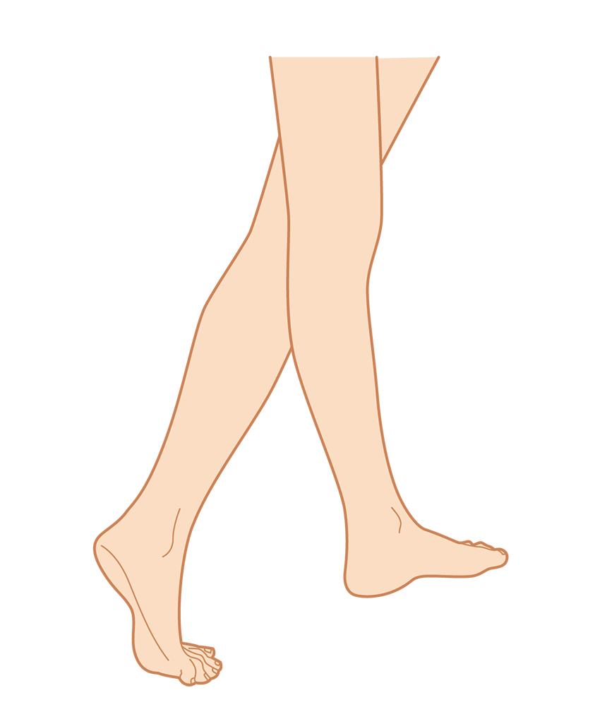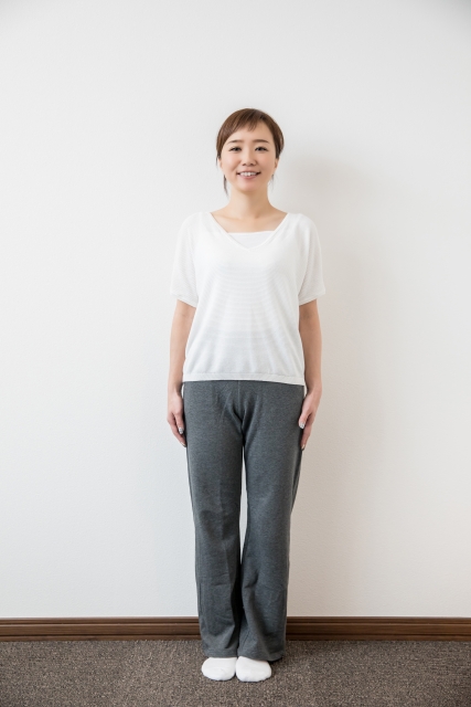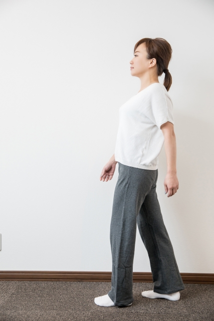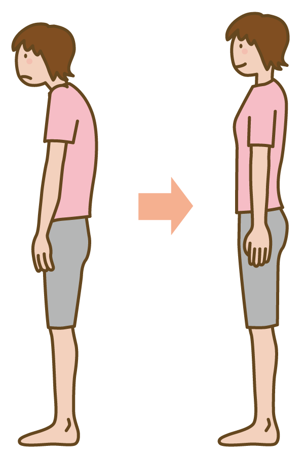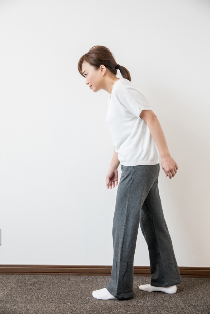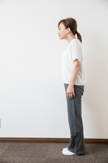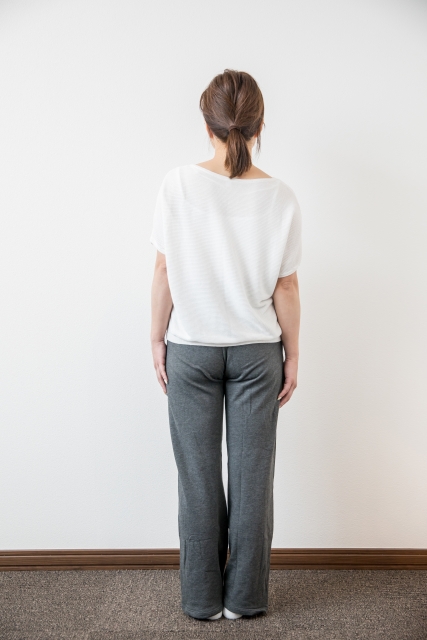 左肩が上がった状態です。バッグをいつも左肩に掛けているとなりやすい姿勢です。アゴが前に突き出た状態、首コリ肩こりの原因です。前かがみな歩行、膝が伸びなくなっています。これら不良姿勢の原因は、体を支えている足にあります。