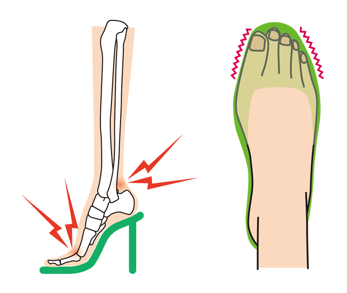 ハイヒールや先の尖ったパンプスなどが足のトラブルを招きます。