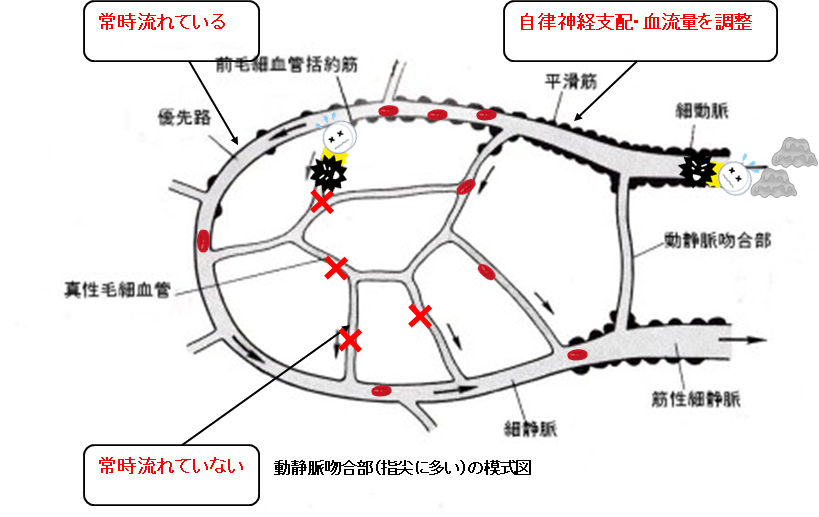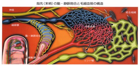 手足の末梢部や皮膚の一部に動静脈吻合部と言う血管構造があります。