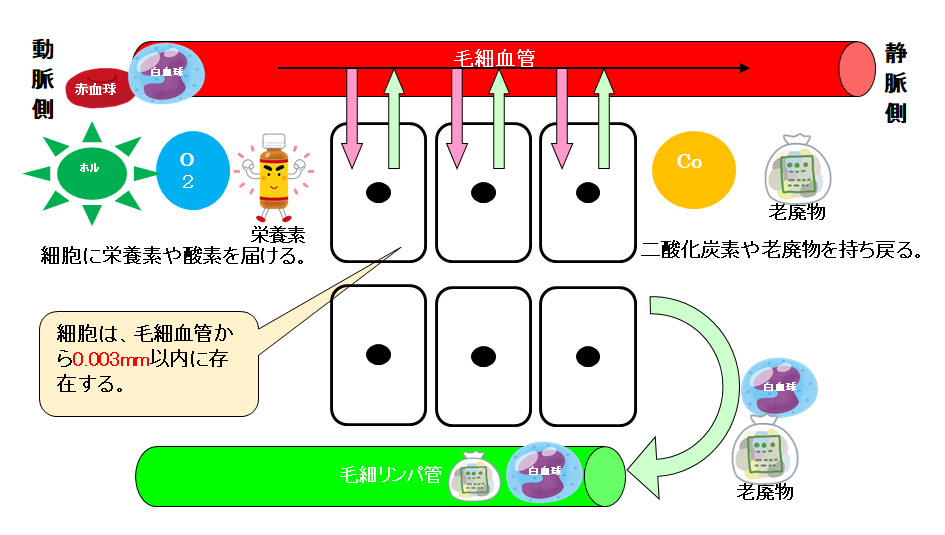 全身37兆個の細胞に酸素と栄養を運び、二酸化炭素と老廃物を持ち帰る生命活動の最前線を担っています。