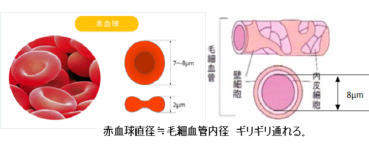 一層の内皮細胞からなり、壊れないように壁細胞が補強しています。内径は約8マイクロメーターで赤血球が一つずつしか通れないほど細い血管です。