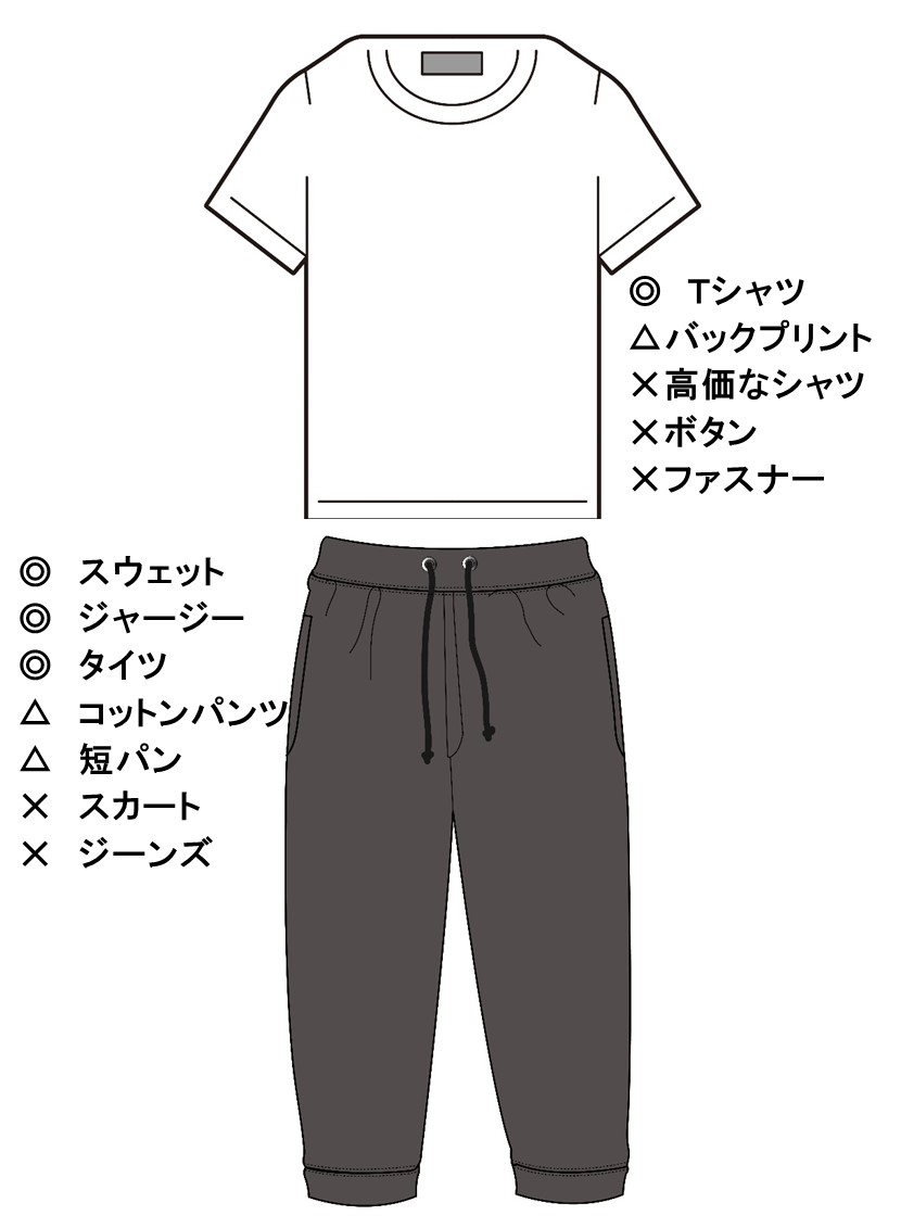 施術を受けられる場合は、上はTシャツ下はジャージーなど施術が受けやすい服装をご用意ください。